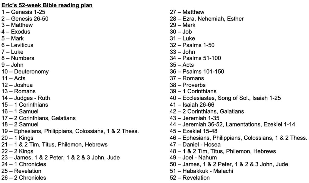 Greetings, friends. It has been a while since I shared a devotional thought with you flowing from my times with the Lord. As I progress through my Bible reading plan (shown below if you are interested), I’m now up to the book of Psalms. The psalms are filled with word pictures, colorful imagery, emotion (positive and negative), Hebrew parallel poetry, and great theology. In Psalm 19, David turns our gaze onto the world, using the image of all creation (specifically the heavens and skies) in verses 1-6 “declaring,” “proclaiming,” “pouring out speech,” with a “voice,” and “words.” All of this communication is focused on exalting God, glorifying Him, revealing knowledge about Him and His handiwork. I can’t wait to go on a backpacking trip this summer with my son Andrew where we will be surrounded by creation declaring God’s glory!